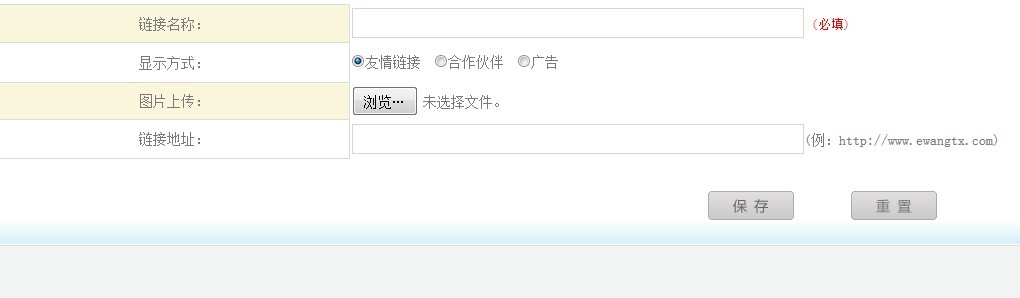 點(diǎn)擊添加友情鏈接,輸入鏈接名稱、顯示方式、圖片上傳、鏈接地址等信息后,保存即可。