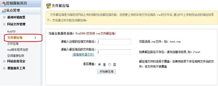 使用主機管理賬號密碼,登陸萬網(wǎng)虛擬主機控制面板http://cp.hichina.com/,選擇其中的“網(wǎng)站文件管理”==>“文件解壓縮”,然后按照提示操作。